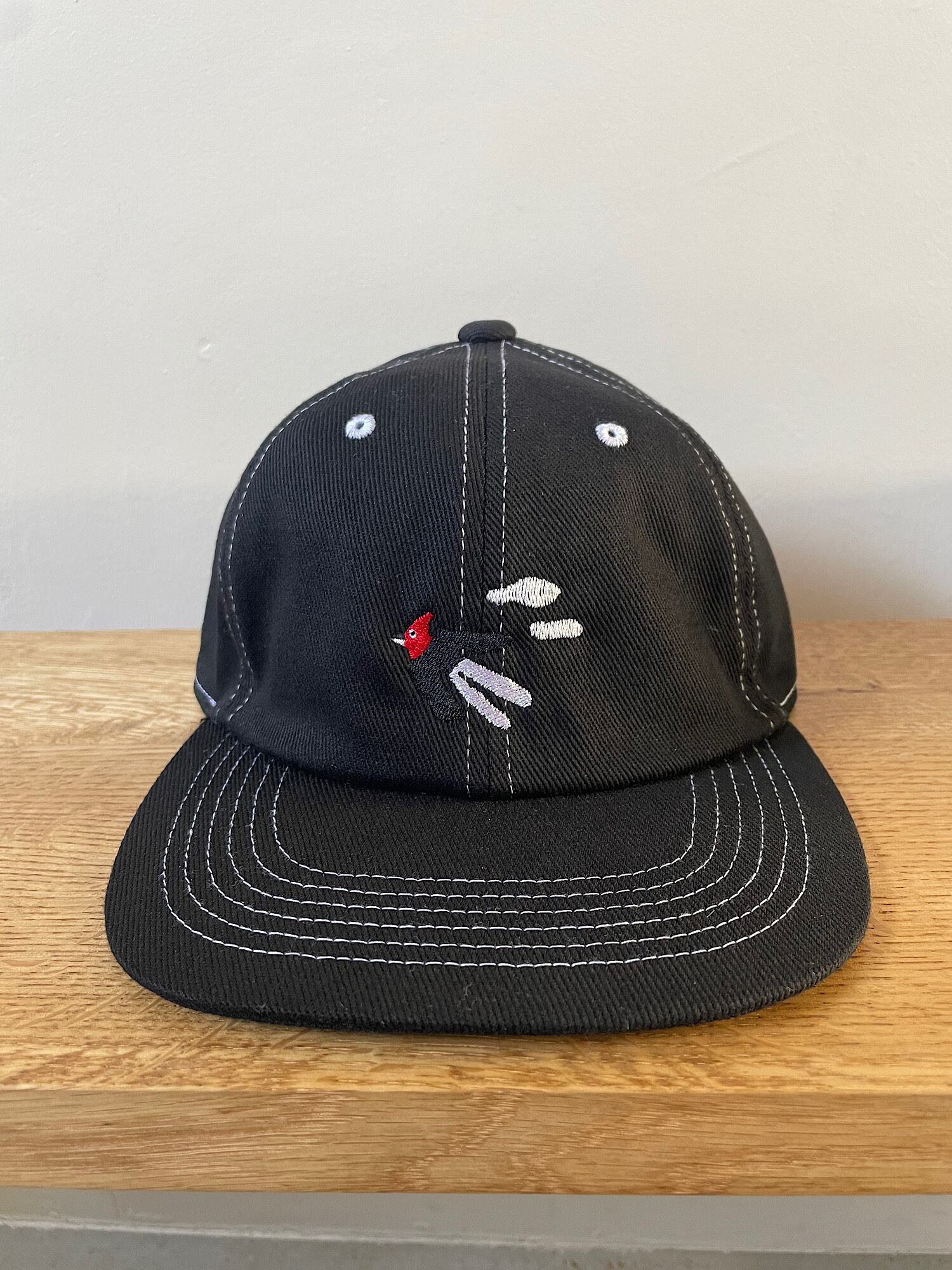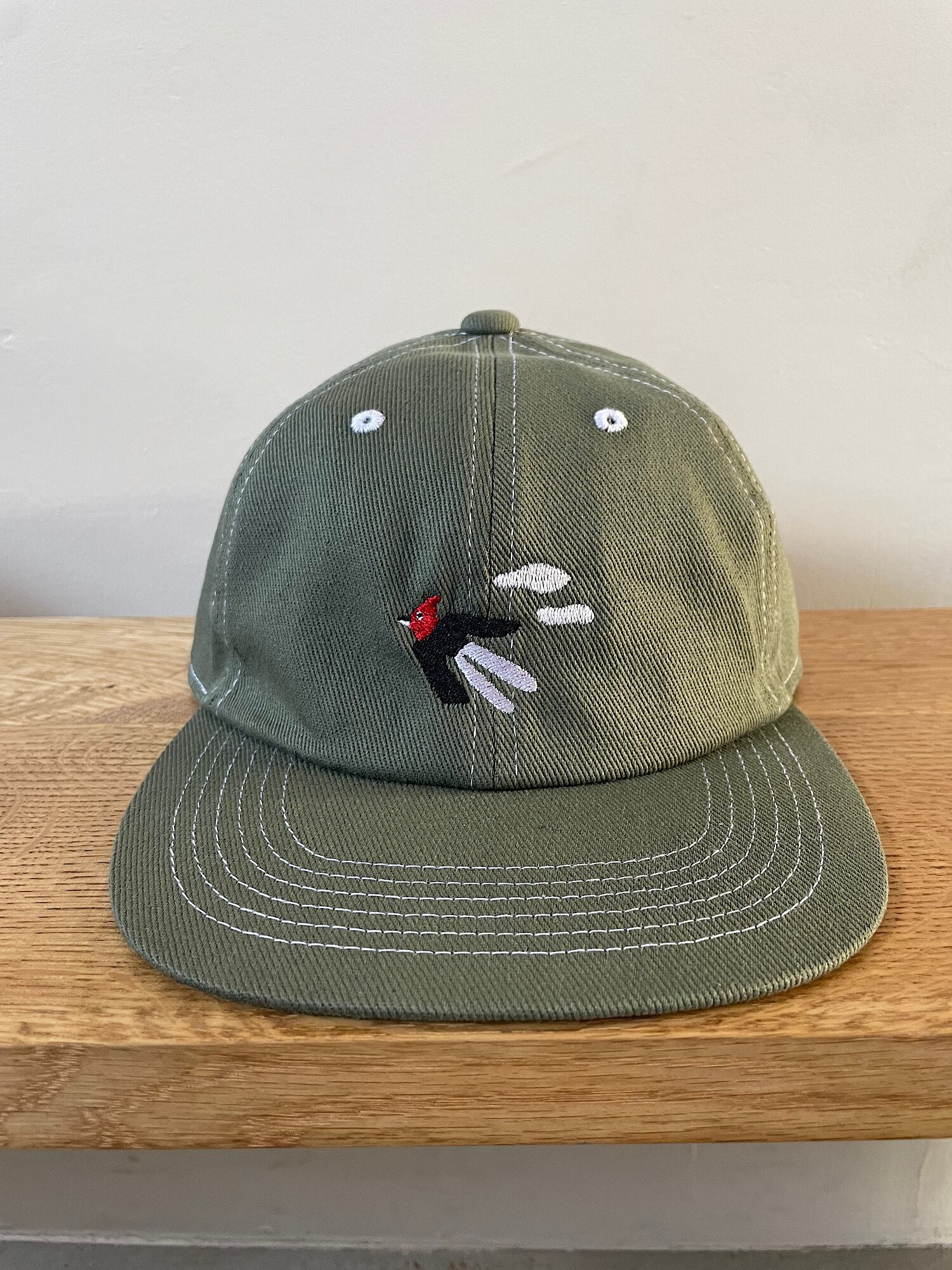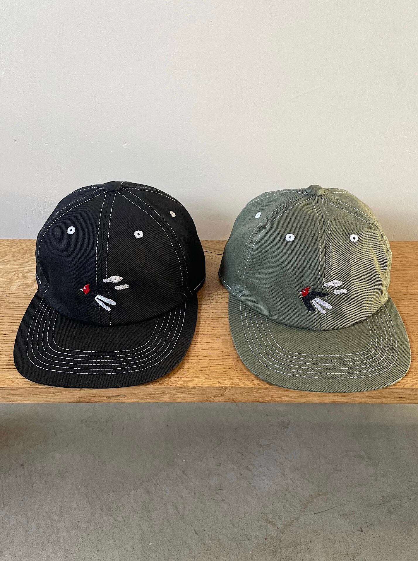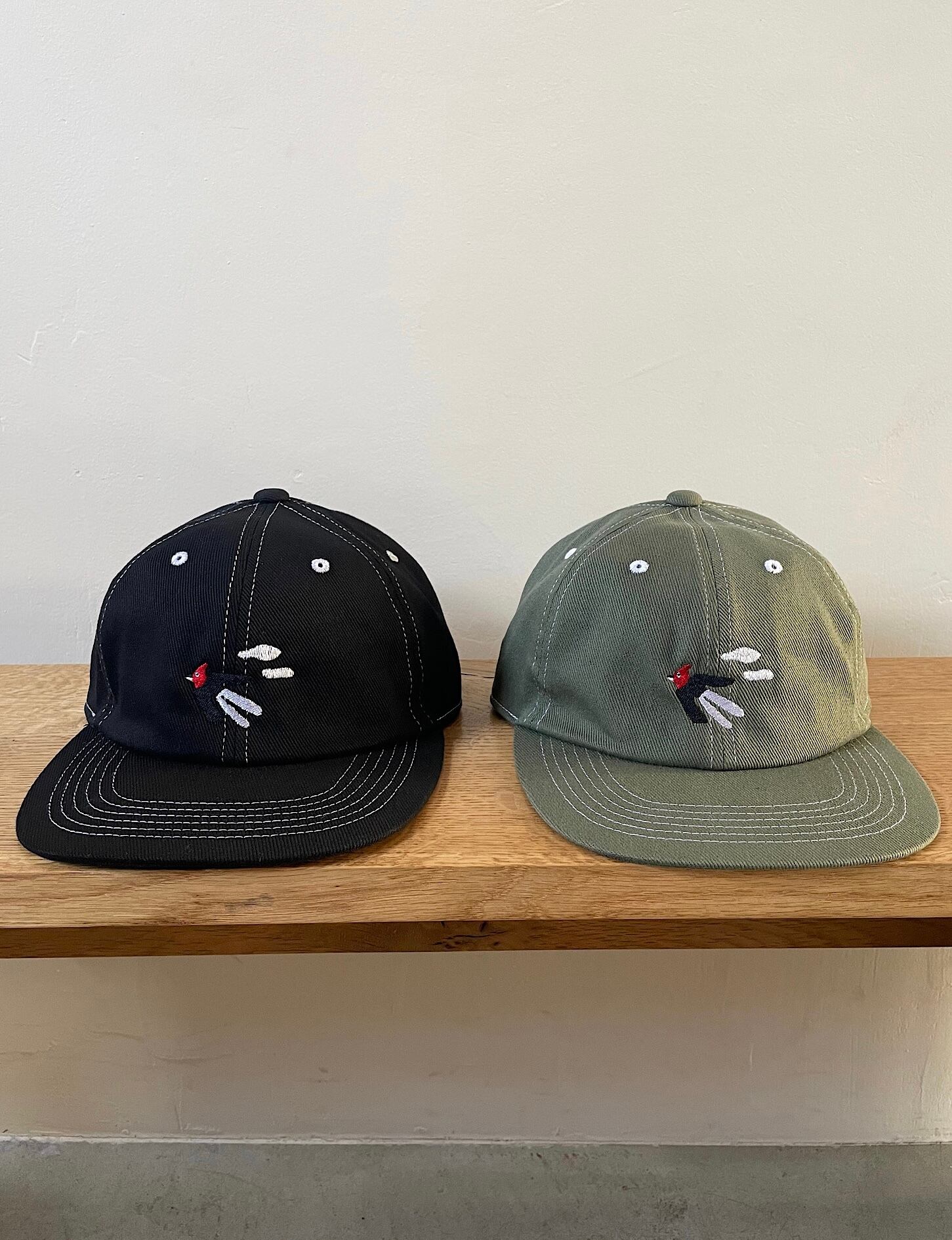 WALK SIGNSさんに描いてもらった店舗ウインドウサインの鳥(Cardinal)を刺繍した6パネルキャップ。